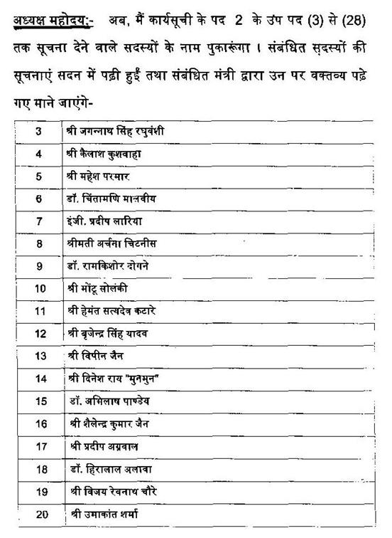 अध्यक्ष महोदय, दूसरा, आपने महिला सदस्यों के लिये मंगलवार का दिन तय किया है यह भी एक नवाचार है. इसके लिये भी मैं आपको बधाई देता हूं. शून्यकाल को लेकर आपने जिस प्रकार से लोकसभा की भांति एक व्यवस्था यहां पर की, तो मेरे ख्याल से मध्यप्रदेश विधान सभा लोकसभा के बाद पहली होगी, जहां आपने शुरुआत की, इसके लिये मैं आपको बधाई देता हूं. सभी की ध्यानाकर्षण की सूचनाएं आपने आज भी लीं और इतने ध्यानाकर्षण मुझे नहीं लगता कि इसके पहले कभी आये हों और सदस्य इस बात के लिये कि उनकी सूचनाओं पर कार्यवाही होगी इसको लेकर खुश हैं, मैं आपको यह भी अवगत कराना चाहता हूं. निश्चित तौर से नवाचार और नई व्यवस्थाएं आपके अध्यक्ष होते हुये रहेंगी और मैं आपको विश्वास दिलाता हूं कि हमारे विपक्ष की ओर से आपको पूरा सहयोग और आपका आशीर्वाद हम सब पर बना रहेगा. धन्यवाद.