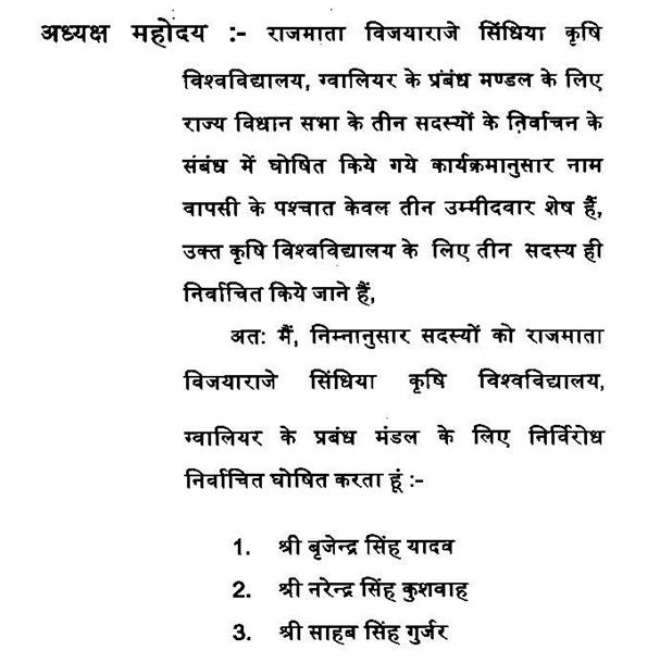 राजमाता विजयाराजे सिंधिया कृषि विश्वविद्यालय, ग्वालियर के प्रबंध मण्डल के लिए राज्य विधान सभा के सदस्यों का निर्वाचन