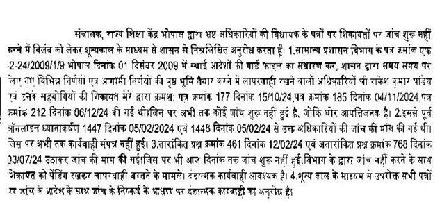 3. राज्य शिक्षा केन्द्र भोपाल में भ्रष्ट अधिकारियों की विधायक से प्राप्त शिकायत पत्रों पर जांच शुरु करने में विलंब किया जाना