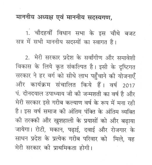 राज्यपाल के अभिभाषण पर चर्चा के लिये मैं, दिनांक 23, 27, 28 फरवरी एवं 2 मार्च, 2017 नियत करता हूं.