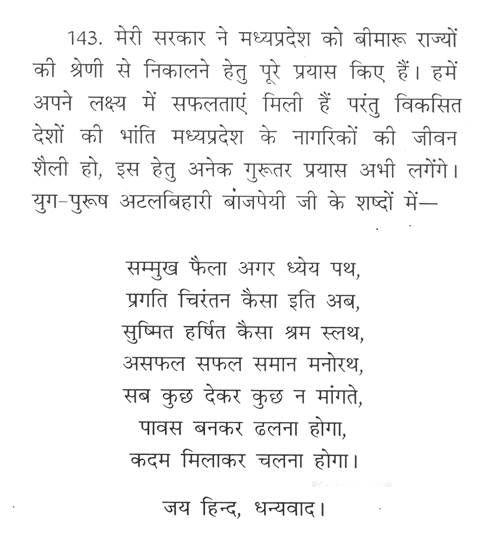 '' राज्यपाल ने जो अभिभाषण दिया उसके लिए, मध्यप्रदेश की विधान सभा के इस सत्र में समवेत सदस्यगण अत्यंत कृतज्ञ हैं.