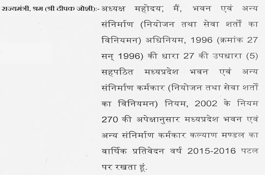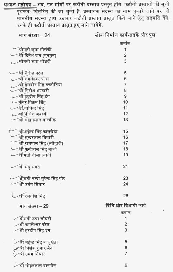 पंचायत एवं ग्रामीण विकास मंत्री (श्री गोपाल भार्गव)-- माननीय अध्यक्ष महोदय, हम सभी विधायक इस लेजिस्लेटिव असेम्बली के मेंबर हैं. हम विधायी कार्य के लिये यहां पर बैठे हैं और चुने गये हैं, हम कोई इंस्पेक्टर या सुपरवाइजर नहीं है, इस कारण से हमें यह कार्य नहीं करना चाहिये.
