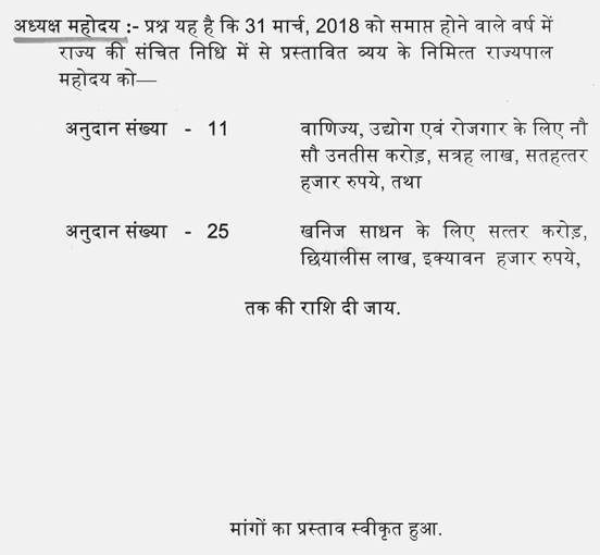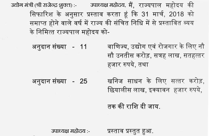श्री राजेन्द्र शुक्ल--अध्यक्ष महोदय, अनुबंध की कॉपी तो कल ही मिल जाएगी. आदरणीय बाला बच्चन जी बहुत सीनियर मेम्बर हैं और उप नेता प्रतिपक्ष भी हैं इसलिए यह कहना ठीक नहीं है और अच्छा नहीं लगता कि कितने मूल्य के हीरे चुराये. वास्तव में इसमें 64 लाख रुपये की रॉयल्टी उन्होंने उस रॉ डायमण्ड के लिए जमा की है जिसको सेम्पलिंग के लिए वह बाहर ले जाते थे यह देखने के लिए कि इसमें किस क्वालिटी का डायमण्ड है.