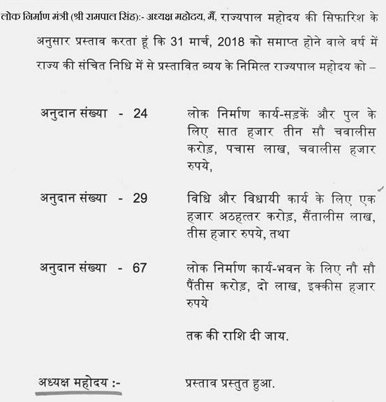 लोक निर्माण एवं विधि और विधायी कार्य मंत्री (श्री रामपाल सिंह)-- अध्यक्ष महोदय, आपने लोक निर्माण विभाग की अनुदानों की मांगों पर चर्चा के लिए जो अमूल्य समय बढ़ाया और हमारे सभी माननीय वरिष्ठ सदस्यो ने और सदस्यों ने जो सुझाव दिए और मार्गदर्शन दिया, उन्होंने विभाग की तारीफ की है और मेरा ज्ञानवर्धन भी किया है उन सबका धन्यवाद करता हूं.