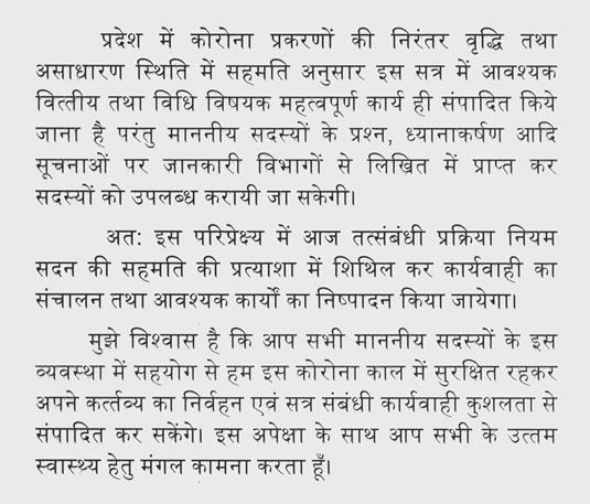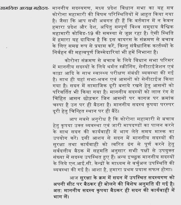कोरोना संक्रमण से बचाव हेतु जारी मापदण्डों का पालन करना एवं माननीय सदस्यों का अपनी सीट से बैठकर ही कार्यवाही में भाग लेना