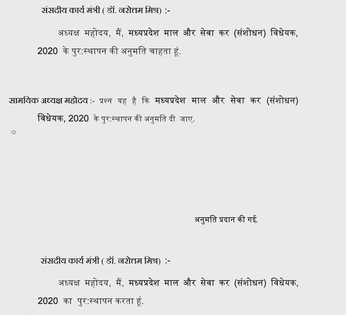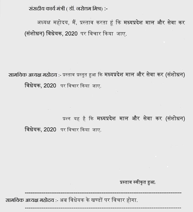 सामयिक अध्यक्ष महोदय - प्रस्ताव प्रस्तुत हुआ कि मध्यप्रदेश नगर पालिक विधि(तृतीय संशोधन) विधेयक,2020 पर विचार किया जाए.