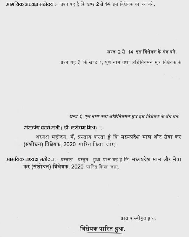 प्रश्न यह है कि मध्यप्रदेश साहूकार(संशोधन)विधेयक,2020 पारित किया जाय.