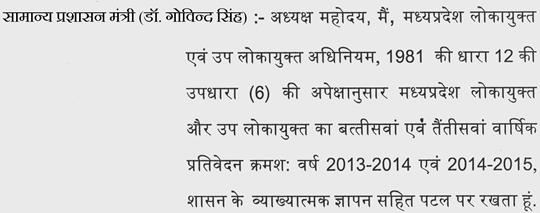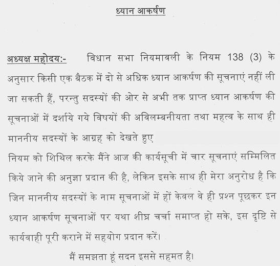 अध्यक्ष महोदय - चन्द्रयान-2 की सफलता में वैज्ञानिकों ने देश का नाम विश्व में गौरवान्वित किया है. मध्यप्रदेश के शहर मंदसौर के श्री हिमांशु शुक्ला, कटनी की मेघा भट्ट ने टीम बूस्टर तैयार करने में वैज्ञानिकों की भूमिका में द्वारा महती योगदान दिया है. (मेजों की थपथपाहट) इससे मध्यप्रदेश गौरवान्वित हुआ है एवं दोनों होनहारों को समूचा सदन, मध्यप्रदेश की ओर से बधाई देता है और उनके उज्ज्वल भविष्य की कामना करता है.
