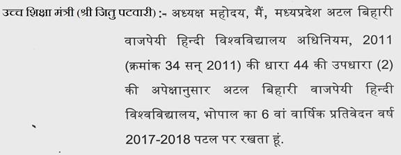 अध्यक्ष महोदय-- मध्यप्रदेश माखनलाल चतुर्वेदी राष्ट्रीय पत्रकारिता एवं संचार विश्वविद्यालय (संशोधन) विधेयक, 2019 (क्रमांक 11 सन् 2019 ) प्रवर समिति को सौंपा गया है.