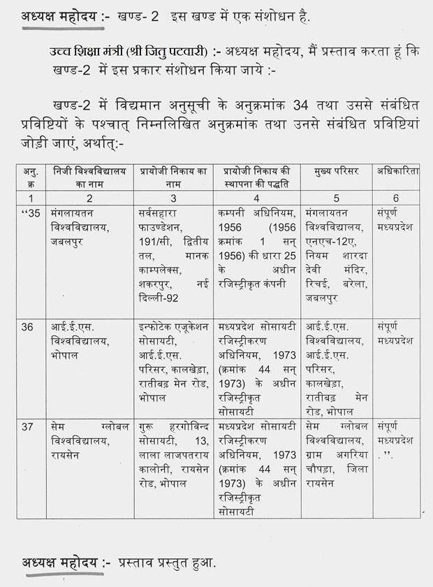 अध्यक्ष महोदय-- संसदीय कार्य मंत्री जी ठीक है आपने निवेदन किया है आप विराजिए. मैं जरा दूसरी बात बोल दूं. यह तो अभी एक विश्वविद्यालय पर किया है मेरा ऐसा मानना है कि जिस क्षेत्र में महाविद्यालय या विश्वविद्यालय हैं वहां के सबंधित विधायक को वहां का मनोनीत सदस्य होना चाहिए ऐसा मेरा मानना है. मैंने एक और इंगित किया है. इतना बड़ा विषय नहीं था. वह तो एक मिनट में हो जाएगा. आप कल बैठकर कर लें कल की कल ला दें तो मैं कल कर लूंगा. बात यह नहीं है. हमारे जो माननीय अधिकारीगण इसको बनाते हैं वह इस बात का ध्यान नहीं रखते कि जिस विधान सभा में यह पारित होने जा रहा है क्या वहां के विधायकों का ध्यान रखा गया है. मेरा इशारा सिर्फ उस और है उसे आप लोग अन्यथा न लें.