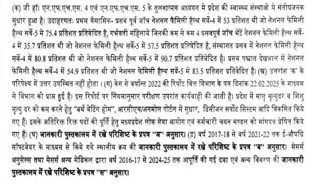 2. ( *क्र. 2830 ) श्री प्रताप ग्रेवाल : क्या उप मुख्यमंत्री, लोक स्वास्थ्य एवं चिकित्सा शिक्षा महोदय यह बताने की कृपा करेंगे कि (क) प्रदेश की लोक स्वास्थ्य अधोसंरचना एवं स्वास्थ्य सेवा पर कैग 2024 का प्रतिवेदन संख्या 6 में उल्लेखित टिप्पणियों से शासन क्या यह मानता है कि क्या प्रदेश की स्वास्थ्य अधोसंरचना एवं सेवा संतोषजनक है? यदि हाँ, तो ऐसे मानने के आधार बिन्दु क्या है? (ख) क्या कैग ने प्रतिवेदन में 8 विषयों पर तथ्य परक निरीक्षण में यह पाया कि स्वास्थ्य अधोसंरचना एवं सेवा निम्न गुणवत्ता की है तथा इस कारण प्रदेश नवजात शिशु, शिशु बाल मृत्यु दर में देश में प्रथम तथा गर्भवती महिला मृत्यु दर में देश में तीसरे स्थान पर है? (ग) कैग ने प्रतिवेदन में 9 अध्याय में 2016 बिन्दुओं पर प्रदेश की स्वास्थ्य अधोसंरचना एवं सेवा में गंभीर कमियां पाई हैं, इन्हें दूर करने के लिये कैग प्रतिवेदन के बाद क्या-क्या प्रयास किये गये? विस्तृत जानकारी दें। (घ) विभिन्न केटेगरी के चिकित्सालयों में जनवरी 2025 में शासकीय सार्वजनिक स्वास्थ्य मानक आई.पी.एच.एस. अनुसार राज्य शासन द्वारा स्वीकृत, कार्यरत आई.पी.एच.एस. से कम संख्या और उनका प्रतिशत स्वीकृत पद से कम संख्या और उनका प्रतिशत, की सूची विशेषज्ञ, चिकित्सक, नर्सिंग स्टाफ तथा पैरामेडिकल स्टाफ अनुसार बतावें। (ड.) कैग के प्रतिवेदन के पैरा 4.8.5 में उल्लेखित 192 मामले की विस्तृत सूची आपूर्तिकर्ता के नाम, दवा का नाम, डी.डी.ओ. का नाम, दिनांक तथा स्थानीय दर सहित देवें तथा बतावें कि अनु सेल्स, अन्य मेडिकल द्वारा वर्ष 2016-17 से 2024-25 तक आपूर्ति की गई दवा के नाम, दर, डी.डी.ओ. का नाम, दिनांक, कुल मात्रा, कुल राशि, भुगतान की राशि सहित देवें।