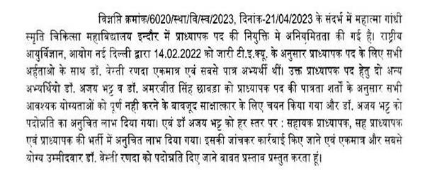 जबकि प्रदेश में विशेषज्ञों के पद जो स्वीकृत हैं वह 5043 पद हैं. उसमें से 3600 पद रिक्त हैं जो कि लगभग 70 प्रतिशत हैं. इनकी पद पूर्ति में कितने वर्ष लगेंगे.इसी तरह मेरे प्रश्न क्रमांक 1269,दिनांक 13.3.2025 के अनुसार धार जिले में स्त्री रोग विशेषज्ञ के 15-17 पद थे उसमें से सिर्फ 2 पद ही भरे हैं अर्थात 90 प्रतिशत पद खाली है और मेरे विधान सभा क्षेत्र में स्त्री रोग विशेषज्ञ का अभी तक कई वर्षों से पद ही नहीं है. मेरा कहना है कि जो विशेषज्ञों के पद रिक्त हैं इन्हें कब तक भर दिया जायेगा ?