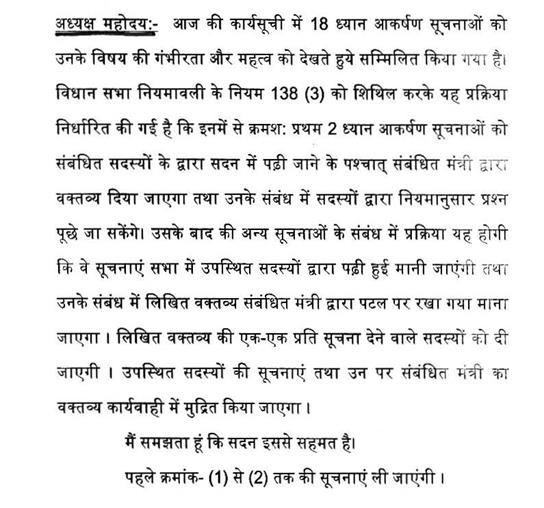 अध्यक्ष जी आपका लंबा अनुभव लोक सभा और विधान सभा का भी है; मैं आपके प्रति भी आभार मानता हूं कि वास्तव में आपके आशीष से हमारा सदन सभी प्रकार से गौरवान्वित हो रहा है और हमारे में से कई सारे सदस्य पहले भी आए थे पहले के सत्रों से किसी की कोई तुलना नहीं करना चाहिए, लेकिन मैं माननीय नेता प्रतिपक्ष सहित, माननीय सदस्यों को भी धन्यवाद देना चाहूंगा कि पहली बार आप भी ऐसी सकारात्मक चर्चाओं में भाग ले रहे हैं, असहमति और सहमति सदन का गौरव होती है. आपकी बात आना अच्छी बात है.