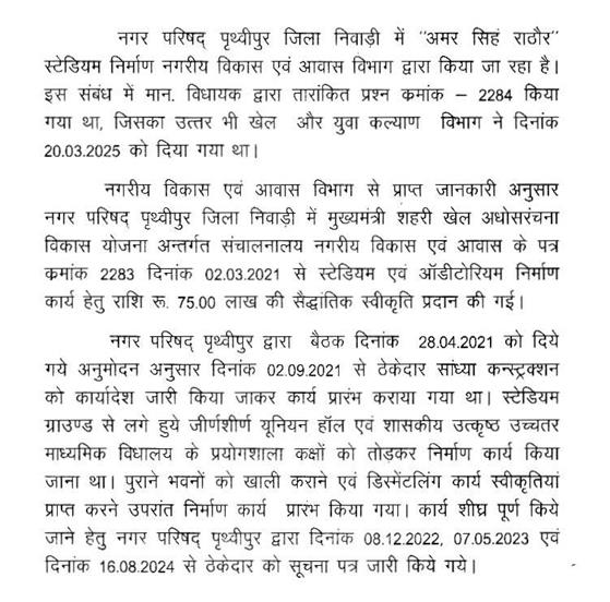 1. ( *क्र. 1442 ) श्री मुकेश मल्होत्रा : क्या राज्य मंत्री, संस्कृति महोदय यह बताने की कृपा करेंगे कि (क) क्या तत्कालीन मुख्यमंत्री महोदय श्री शिवराज सिंह चौहान ने दिनांक 25 नवम्बर, 2017 को शिवपुरी जिले के ग्राम सेसई में जिला श्योपुर के आदिवासी विकास खण्ड कराहल, ग्वालियर के घाटीगांव और अशोक नगर के करीला धाम के पास और कराहल, शिवपुरी गुना में और आदिवासी विकास खण्ड कराहल में 7.50-7.50 करोड़ की लागत से माता शबरी आश्रमों के निर्माण की घोषणा की थी? (ख) प्रश्नांश (क) का उत्तर यदि हाँ, तो क्या आज दिनांक तक उक्त स्थानों में आश्रम निर्माण हेतु भूमि आवंटन, प्रशासकीय स्वीकृति, धनराशि आवंटन कर दिया गया है? यदि हाँ, तो दस्तावेज सहित जानकारी प्रदाय करें। यदि कार्य आरंभ नहीं हुआ है तो क्यों तथा विलंब का कारण बतावें तथा विलंब के दोषियों पर क्या कार्यवाही की जावेगी? (ग) क्या विभाग कराहल व अन्य प्रस्तावित स्थानों पर माता शबरी आश्रमों का निर्माण कार्य शीघ्र आरंभ करेगा? यदि हाँ, तो समय-सीमा बतावें। यदि नहीं, तो क्यों?