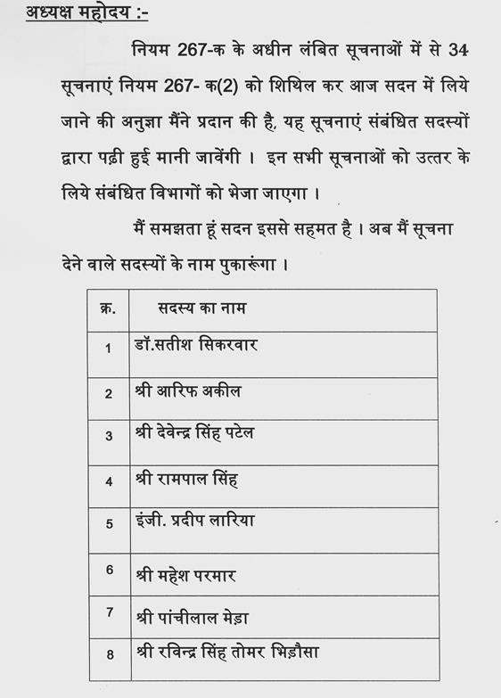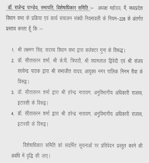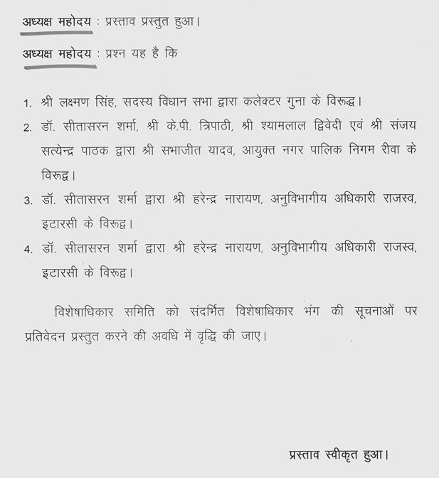 अध्यक्ष महोदय--मैंने डॉ.सीतासरन शर्मा द्वारा श्री हरेन्द्र नारायण अनुविभागीय अधिकारी राजस्व, इटारसी के विरूद्ध दी गई विशेषाधिकार भंग की सूचनाओं को विशेषाधिकार समिति को जांच, अनुसंधान एवं प्रतिवेदन हेतु सौंप दिया है.