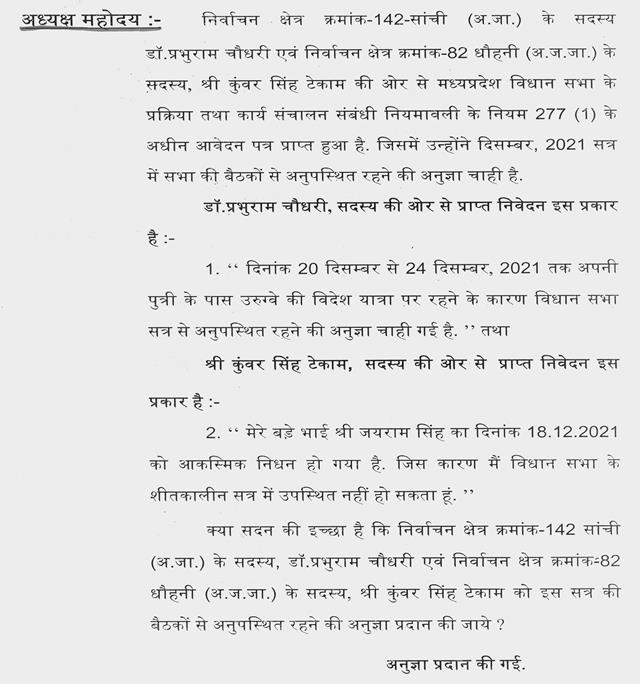 निर्वाचन क्षेत्र क्रमांक-142 सांची (अ.जा.) के सदस्य डॉ.प्रभुराम चौधरी एवं निर्वाचन क्षेत्र क्रमांक-82 धौहनी (अ.ज.जा.) के सदस्य श्री कुंवर सिंह टेकाम की दिसम्बर,2021 सत्र में सभा की बैठकों से अनुपस्थित रहने की अनुज्ञा