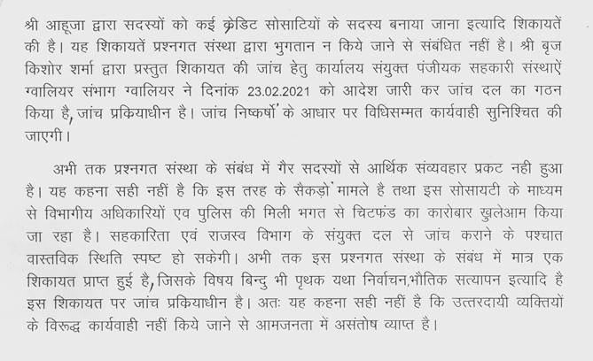 डॉ.अरविंद सिंह भदौरिया -- माननीय अध्यक्ष महोदय, सबसे पहले मैं एक सेकेंड में आपका भी धन्यवाद देता हॅूं. मंत्री बनने के बाद पहली बार प्रश्न कर रहे हैं माननीय सिसौदिया जी बडे़ विद्वान व्यक्ति हैं. बडे़ चिन्तक, विचारक हैं बडे़ नॉलेजिबल व्यक्ति हैं, उनका भी धन्यवाद देता हॅूं कि आप मुझसे प्रश्न कर रहे हैं. माननीय मुख्यमंत्री जी और सदन का भी धन्यवाद देता हॅूं जो माननीय सिसौदिया जी ने जो विषय उठाए हैं वह महत्वपूर्ण हैं पिछली सरकार के समय, चाहे सरकार कोई भी हो, हमारी हो या आपकी हो किसी की भी हो उस समय जो आपने कहा और अनियमितता जो हुई है उससे 3 करोड़ 58 लाख रुपए की जो भी अनियमितता उस समय हुई थी इसके अतिरिक्त खाद्य सब्सिडी 1 करोड़ 37 लाख रुपए थी जो कुल मिलाकर 4 करोड़ 95 लाख रुपए की राशि होती है. इसमें से अभी तक 3 करोड़ 32 लाख रुपए उनसे वसूल कर लिया गया है लेकिन जो सब्सिडी की राशि है वह 1 करोड़ 63 लाख रुपए वसूली की कार्यवाही जारी है. अब आपने मुझे जो प्रश्न किया है ट्रांसपोर्टर के खिलाफ एफआईआर हो गई, उनके पिताजी के खिलाफ एफआईआर हो गई है तो जो इसमें सहकारी समितियों के प्रबंधक थे उनके खिलाफ भी एफआईआर कर दिया है जो बाकी बचा हुआ पैसा है वह भी उनसे वसूली कर रहे हैं. एक आपने प्रश्न किया है कि क्या उनकी संपत्ति को राजसात किया जाएगा? तो सहकारी अधिनियम में संपत्ति को राजसात करने, कुर्की तथा नीलामी का प्रावधान है. इसके अन्तर्गत कार्यवाही जरूर कराएंगे, आप निश्चिन्त होकर रहिए. आवश्यकता पड़ने पर सहकारी अधिनियम के अलावा भी अन्य एजेन्सियों के द्वारा भी इस पर कुर्की की, राजसात करने की, कार्यवाही कराएंगे, हंड्रेड परसेंट. दूसरा आपका एक प्रश्न है कि इसमें वहाँ के महाप्रबंधक और भी लोग, आपको डाउट है, ऐसे तीन विभागों का इसमें इन्वॉल्वमेंट था और तीनों विभागों के लिए, आपने मांग नहीं की है, मैं घोषणा करना चाहता हूँ कि उच्च स्तरीय एक कमेटी बनाकर तीनों विभागों के संबंधित जो भी अधिकारी, कर्मचारी, होंगे उनको छोड़ा नहीं जाएगा, उन पर एफ आई आर कराई जाएगी, जो भी दोषी होगा उस पर कार्यवाही की जाएगी, तो यह भी हम एक जाँच दल गठित कर देते हैं. इस पर और कुछ आपका प्रश्न हो?