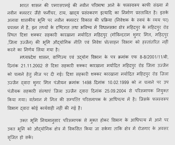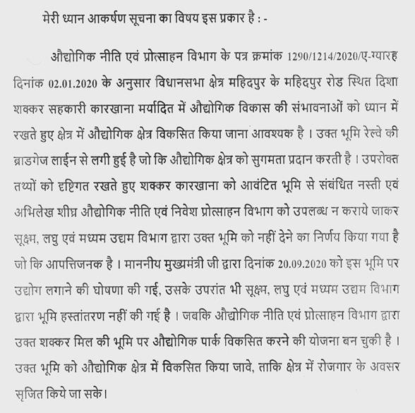 श्री बहादुरसिंह चौहान -- माननीय अध्यक्ष जी, सन् 1941 में सेठ गोविन्दनाथ शुगर मिल के नाम से शुगर मिल चलता था. गन्ने की कमी के कारण शुगर मिल बंद हो गई और सन् 1996 में पहले उद्योग विभाग एक ही हुआ करता था, उसके नाम से सन् 1996 में यह भूमि उनको आवंटित हो गई. मेरे 2018 में विधायक बनने के बाद मैंने उद्योग नीति एवं निवेश प्रोत्साहन विभाग को पत्र दिया और उस पर कार्यवाही प्रारंभ हुई और उन्होंने पूरी कार्यवाही करके सूक्ष्म, लघु एवं मध्यम उद्यम विभाग से यह निवेदन किया कि यह आपकी जो भूमि है, यह हमारे विभाग को स्थानांतरित कर दी जावे. लेकिन एक वर्ष एक माह के बाद आपका एम एस एम ई पत्र में यह कहते हैं कि इस भूमि को हम स्थानांतरित न करते हुए हम स्वयं इसमें उद्योग लगाना चाहते हैं. माननीय अध्यक्ष जी, मुझे कोई आपत्ति नहीं है. इसमें मेरा मंत्री जी से यह निवेदन है कि उद्योग नीति एवं निवेश विभाग को यह विभाग जमीन स्थानांतरित कर दे, हमारी पहली मांग यह है और यदि ये स्थानांतरित करना नहीं चाहते हैं और एम एस एम ई स्वयं वहाँ पर रोजगार सृजित करना चाहते हैं तो मुझे उसमें भी कोई आपत्ति नहीं है. अध्यक्ष महोदय, वर्तमान में इस भूमि के मालिक मध्यप्रदेश राज्य जो है निगम इसके अधीनस्थ है और वह जो निगम है वह एम एस एम ई के अन्तर्गत ही आता है तो कुल मिलाकर जमीन के जो भू आवंटन के मालिक हैं वह आज एम एस एम ई है. इनको किसी से भूमि लेने की आवश्यकता नहीं है. उस पर आज की तारीख में परिसमापक के रूप में उप पंजीयक, सहकारिता उज्जैन उसके कब्जे में उसको परिसमापक घोषित कर रखा है, देखरेख के लिए वह भूमि दी गई है. मात्र 30-40 लाख रुपये की देनदारी है. इसमें मेरा मंत्री जी से निवेदन यह है कि माननीय मंत्री जी, इस भूमि को, जो हमने एक वर्ष पहले आपको पत्र दिया था 02.01.2020 को, आप औद्योगिक नीति एवं निवेश प्रोत्साहन विभाग को यह जमीन स्थानांतरित कर दें, चूँकि उनकी पूरी तैयारी होकर पार्क की पूरी तैयारी उन्होंने कर ली है, स्थल का निरीक्षण कर लिया है और वह उद्योग लगाने को तैयार हो गए हैं. लेकिन भारत सरकार की नई नीति आई उसमें इनका विभाग स्वयं उद्योग लगाना चाहता है तो मेरा आप से प्रश्न यह है कि क्या माननीय मंत्री जी, हमारे उद्योग नीति एवं निवेश प्रोत्साहन विभाग को यह जमीन देंगे और यदि जमीन नहीं देंगे तो क्या आप स्वयं उद्योग लगाएंगे और यदि लगाएंगे तो कब तक लगाएंगे?