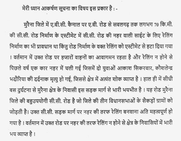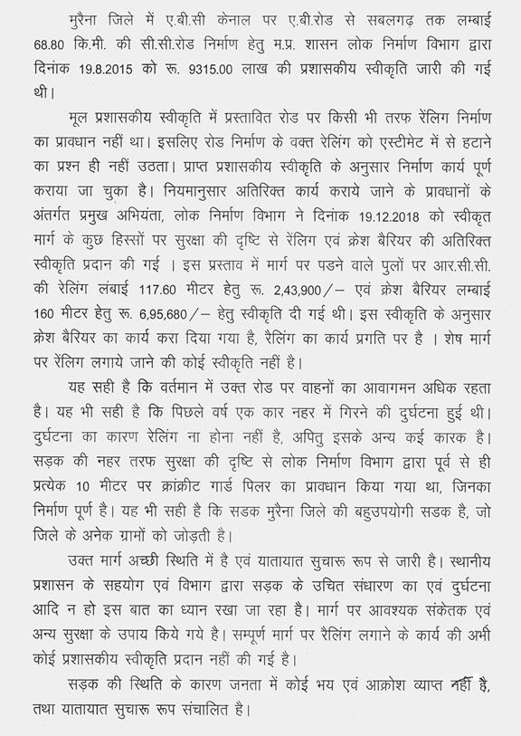 (2) मुरैना जिले के ए.बी.सी. केनाल एवं ए.बी. रोड के नहर साईड रेलिंग का निर्माण न किये जाने से उत्पन्न स्थिति
