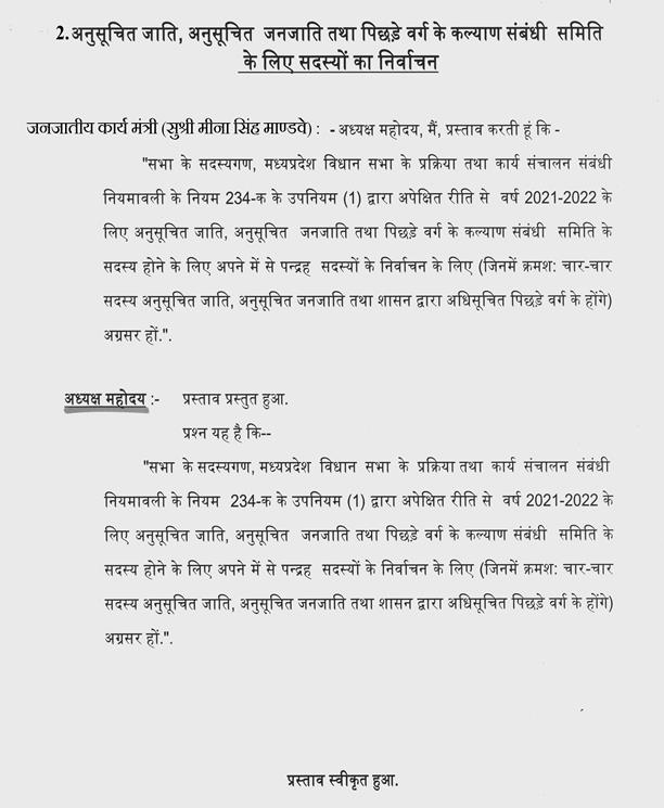 ''यह सदन केन्द्र शासन से अनुरोध करता है कि मध्यप्रदेश राज्य में पिछड़े वर्ग की सूची के क्रमांक -88 में शामिल वैसवार जाति एवं राज्य में पिछडे़ वर्ग की सूची के क्रमांक -59 में शामिल लोढ़ा(तंवर) जाति को केन्द्र शासन के अन्य पिछड़े वर्ग की सूची में भी शामिल किया जाये''.