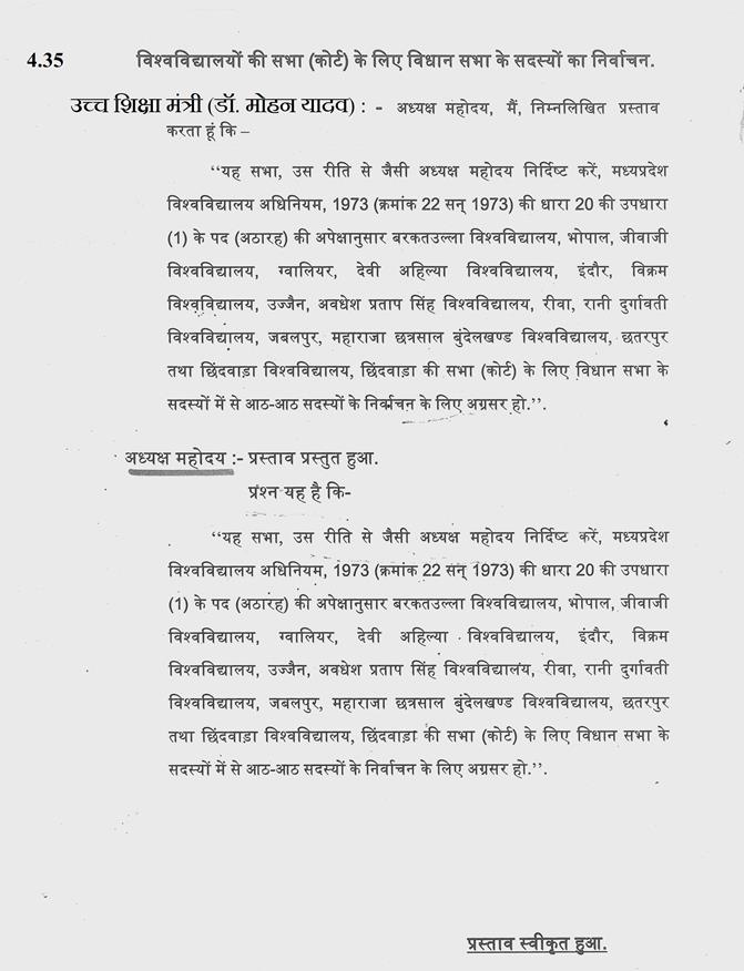 डॉ.मोहन यादव-- माननीय अध्यक्ष महोदय, माननीय विधायक जी ने जो बात रखी है पहला पत्र उन्होंने जो दिया वह तो मेरी जानकारी में नहीं है, लेकिन मैं उसका भी कोई बुरा नहीं मानता. दूसरा जो पत्र आपने मुझे दिया है, मैंने आपको भी जवाब दिया है और विभाग को भी उसकी चिट्ठी दी है. तीसरी महत्व की बात आपने कही कि जो हमारे प्राध्यापक हैं, जो यू जी अगर खोलते हैं, पी जी खोलते हैं तो उसके प्राध्यापकों के पद होने चाहिए. मैं स्वीकार करता हूँ इस बात के लिए कि पी जी अगर हमने खोली है तो हमको तत्समय ही उसके पद दे देने चाहिए थे. लेकिन मैं बताना चाहता हूँ कि पिछली समीक्षा बैठक में हमने निर्णय किया है कि सबसे पहले, जहाँ जहाँ भी हमने नये कोर्स खोले हैं, उनके संबंधित सभी विषयों के प्राध्यापकों को हम देने का प्रयास करेंगे, अगले सत्र से आपको किसी भी हालत में पी जी के शिक्षक मिल जाएँगे.