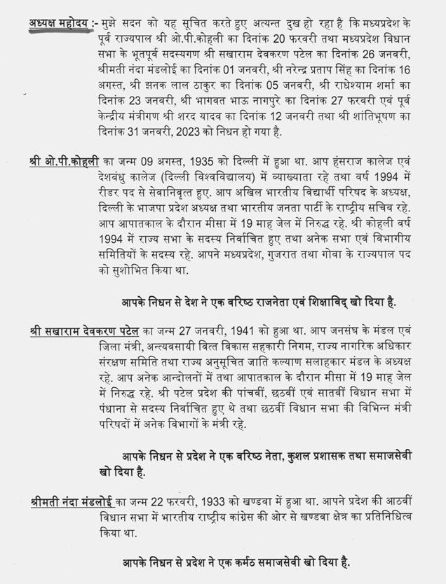 नेता प्रतिपक्ष (डॉ. गोविन्द सिंह) -- माननीय अध्यक्ष महोदय, माननीय मुख्यमंत्री जी और आपने हमारे देश और प्रदेश के सम्माननीय राजनैतिक राजनेता, जनता के बीच काम करने वाले और समाज में क्षेत्र और देश को दिशा देने वाले आदरणीय ओ.पी. कोहली जी मध्यप्रदेश के भूतपूर्व राज्यपाल महोदय, सखाराम देवकरण पटेल साहब, भूतपूर्व सदस्य, श्रीमती नंदा मण्डलोई, भूतपूर्व विधान सभा सदस्य, नरेन्द्र प्रताप सिंह जी भूतपूर्व विधान सभा सदस्य, झनक लाल ठाकुर जी, भूतपूर्व विधान सभा सदस्य, राधेश्याम शर्मा जी, भूतपूर्व विधान सभा सदस्य, भागवत भाऊ नागपुरे, भूतपूर्व विधान सभा सदस्य, शांति भूषण जी पूर्व केन्द्रीय मंत्री इन लोगों ने अपने सामाजिक, राजनैतिक जीवन में अलग-अलग क्षेत्रों में जनता के गरीब शोषित, पीडि़तों की मदद की और अपना संपूर्ण जीवन जनता के हित में, परोपकार में और गरीबों की लड़ाई में अर्पित किया है. मैं इन सभी के चरणों में श्रद्धांजलि अर्पित करता हूं.