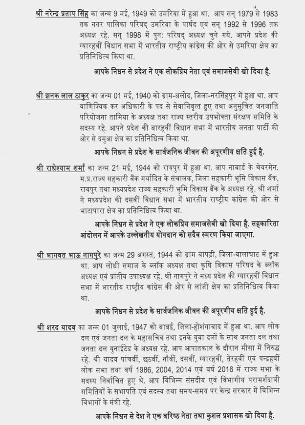 सम्माननीय सखाराम देवकरण पटेल साहब, श्रीमती नंदा मण्डलोई जी, श्री नरेन्द्र प्रताप सिंह जी, भूतपूर्व विधान सभा सदस्य, श्री झनक लाल ठाकुर जी जो हमारे छिंदवाड़ा जिले से विधायक चुने जाते रहे हैं और जुन्नार देव में, हमारे जो हमारा आदिवासी क्षेत्र है, वहां से इस सदन के सदस्य रहे. हम लोगों ने साथ-साथ काम किया है. अभी उनके बेटे आशीष हमारी पार्टी और अनुसूचित जनजाति बेल्ट में वह काम करते हैं . एक ऐसे जमीनी नेता को हमने खोया है, जिनकी सुदूर बैगा और भारिया जाति के बीच में उनकी बड़ी अच्छी पकड़ थी.