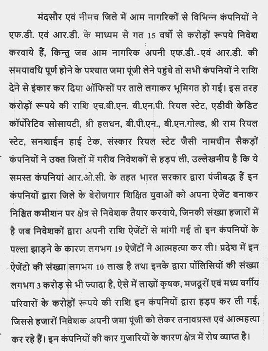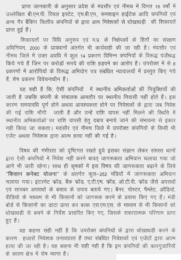 (1) मंदसौर एवं नीमच जिले में चिटफंड कंपनियों द्वारा निवेशकों की राशि हड़पी जाने से उत्पन्न स्थिति.