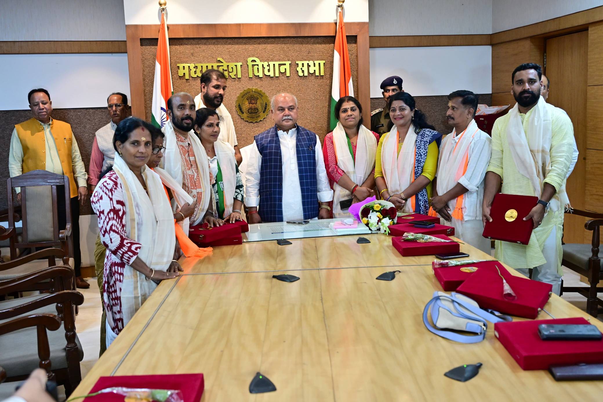 केरल राज्य से मध्यप्रदेश प्रवास पर आये पार्षदों एवं जनप्रतिनिधियों ने आज विधान सभा में माननीय विधान सभा अध्यक्ष जी श्री नरेंद्र सिंह तोमर से सौजन्य भेंट कर राज्य की राजनीति/भौगोलिक आर्थिक पर्यटन एवं विकास कार्यों के संबंध में विभिन्न मुद्दों पर चर्चा की। मा. अध्यक्ष जी ने मध्यप्रदेश के राजनीतिक इतिहास एवं विधान सभा की कार्रवाई में ई विधान / ऑनलाइन प्रक्रिया, जन प्रतिनिधियों के आचरण व्यवहार के संबंध में मार्गदर्शन दिया। प्रतिनिधिमंडल ने विधान सभा भवन का भी अवलोकन किया.