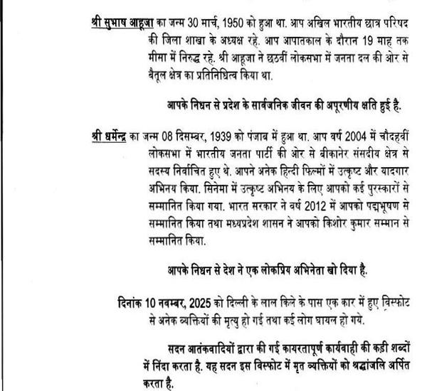 मुख्यमंत्री (डॉ.मोहन यादव)—माननीय अध्यक्ष जी जैसा कि आपने उल्लेखित किया है कि हमारे विधान सभा के भूतपूर्व सदस्यगण स्वर्गीय श्री इन्दर सिंह गोठी, स्वर्गीय श्री राधेश्याम शुक्ल जी, डॉ.सूर्यप्रकाश सक्सेना जी, श्रीमती रजनी उपासने जी, स्वर्गीय श्री चन्द्रकुमार भानोत जी, स्वर्गीय श्री बनवारीलाल अग्रवाल जी, श्री शंकरलाल तिवारी जी, स्वर्गीय श्रीमती लोरेन बी.लोबो जी, नागालैण्ड के राज्यपाल एवं भूतपूर्व राज्यसभा सदस्य ला गणेशन जी, मान्यवर श्री प्रकाश जायसवाल जी, श्री सुभाष आहूजा जी, हमारे सुप्रसिद्ध अभिनेता धर्मेन्द्र जी सहित कई महत्वपूर्ण हस्तियां हमारे बीच से गई हैं जैसा कि आपने उल्लेखित किया है कि स्वर्गीय श्री इन्दर सिंह गोठी 1 अप्रैल 1934 को ग्राम हुंसी से आप राष्ट्रीय स्वयं सेवक संघ के सक्रिय स्वयं सेवक रहे हैं जिनकी अपनी पहचान रही है. आप प्रारंभ सरपंच के जीवन से करते हैं बाद में आपातकाल में भी जनतंत्र की लड़ाई लड़ते हुए 19 महीने तक तत्कालीन कांग्रेस सरकार के विरोध में अपनी न केवल अपने परिवार को दांव पर लगाकर कई कठिनाइयों के बीच भी आपने अपने जनतंत्र की लड़ाई को जारी रखा और चतुर्थ विधान सभा में जनसंघ की ओर से गुलाना का आपने प्रतिनिधित्व किया. आपके निधन से भी सार्वजनिक जीवन में अपूरणीय क्षति हुई है. श्री राधेश्याम शुक्ल पंचायत खेरा के अध्यक्ष, राज्य परिवहन निगम के उपाध्यक्ष, आप मध्यप्रदेश की पांचवी, छठवीं और सातवीं विधान सभा के माननीय सदस्य रहे हैं आपके निधन से भी सार्वजनिक जीवन की अपूरणीय क्षति हुई है. डॉ.सूर्यप्रकाश सक्सेना जी, नेशनल मेडिकल एसोसिएशन के महामंत्री, उपभोक्ता भंडार विदिशा के अध्यक्ष, विदिशा नगरपालिका का पार्षद, आपने प्रदेश की पांचवी विधान सभा में कांग्रेस की ओर से विदिशा क्षेत्र का प्रतिनिधित्व किया आपके निधन से प्रदेश ने कर्मठ समाजसेवी खोया है. श्रीमती रजनी उपासने जी महिला कार्यकर्ता के नाते से जनसंघ के जमाने से हमारे बीच में बड़ा नाम रही हैं. आप 1970 से कार्यकर्ता रही हैं आपातकाल में भी भूमिगत होकर के आपने आंदोलन का संचालन किया. छठवीं विधान सभा में भी आप जनता दल की ओर से रायपुर नगर का प्रतिनिधित्व करते हुए आपने अपनी एक पहचान बनाई थी आपने निधन से एक महिला नेत्री को हम लोगों ने खोया है. श्री चन्द्रप्रकाश भानोत जी, आपका जन्म जबलपुर में हुआ आप 1973 में पार्षद बने, स्थायी कमेटी के अध्यक्ष रहे. श्री भानोत जी सातवीं, आठवीं विधान सभा में भारतीय राष्ट्रीय कांग्रेस की ओर से आपने जबलपुर का प्रतिनिधित्व किया. सातवीं, आठवीं विधान सभा अवधि में अनेक विभागों में राज्यमंत्री जी के रूप रहे हैं. आपके निधन से भी एक वरिष्ठ नेता तथा एक कुशल प्रशासक को हमने खो दिया है.