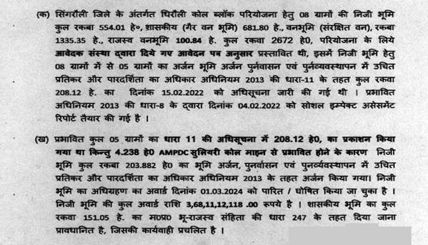 2. ( *क्र. 2873 ) श्री उमंग सिंघार : क्या राजस्व मंत्री महोदय यह बताने की कृपा करेंगे कि (क) जिला सिंगरौली के अंतर्गत धिरौली कोयला परियोजना के लिये कुल 2672 हेक्टेयर भूमि के अधिग्रहण हेतु मध्यप्रदेश सरकार द्वारा भूमि अधिग्रहण, पुनर्वास एवं पुनर्स्थापन में उचित प्रतिकर और पारदर्शिता का अधिकार अधिनियम 2013 के अंतर्गत कितनी भूमि के लिये अधिसूचना जारी की गई थी? साथ ही सोशल इम्पेक्ट असेसमेंट रिपोर्ट कब तैयार की गई? (ख) प्रश्नांश (क) के प्रकाश में कितनी भूमि का अधिग्रहण निजी तथा सरकारी भूमि का किया गया? इसके नोटिफिकेशन कब-कब जारी किये गये? इस आधार पर कितनी मुआवजा राशि दी गई है? (ग) क्या सरकारी भूमि का मुआवजा प्राप्त हो गया है, तो कितना एवं कब? (घ) क्या धिरौली कोयला प्रक्षेत्र संविधान की छठवीं अनुसूची के अंतर्गत आता है या नहीं? यदि नहीं, तो किस आधार पर अधिग्रहण की कार्यवाही की गई?