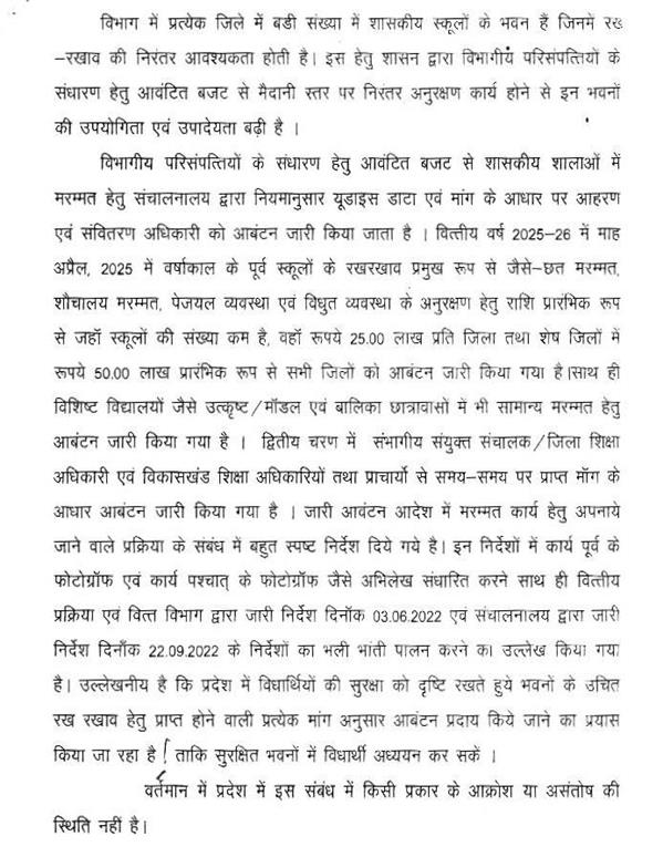 माननीय अध्यक्ष महोदय, स्कूलों में फर्नीचर आदि की बात चली थी. बच्चों को जहां 5-7 घंटे बैठना पड़ता है. उनको अच्छी क्वॉलिटी वाला फर्नीचर उपलब्ध हो, इसलिए मैं माननीय सदस्यों से आग्रह करूंगा कि सांदीपनि स्कूल्स में तो फर्नीचर बहुत अच्छे हैं जो दूसरे स्कूल्स हैं जो हॉयर सेकेण्डरी लेवल के हैं या अन्य स्कूलों में एक बार आप जरूर जाइएगा, उन फर्नीचर्स को देखिएगा कि किसी भी प्राइवेट इंस्टीट्यूशंस से बेहतर फर्नीचर हमारे शिक्षा विभाग ने हमारे स्कूल्स के अंदर उपलब्ध कराए हैं. (मेजों की थपथपाहट) बच्चों को हमने बहुत आरामदायक फर्नीचर दिये हैं. और विभाग द्वारा प्रदेश के लगभग 4 हजार हाई और हॉयर सेकेण्डरी स्कूल्स में 2 लाख ड्यूअल डेस्क और चेयर सेट हमने उपलब्ध कराए हैं और इसके लिए अभी वर्ष 2026-27 में लगभग राशि रूपए 200 करोड़ का इसमें प्रोवीजन भी किया गया है.