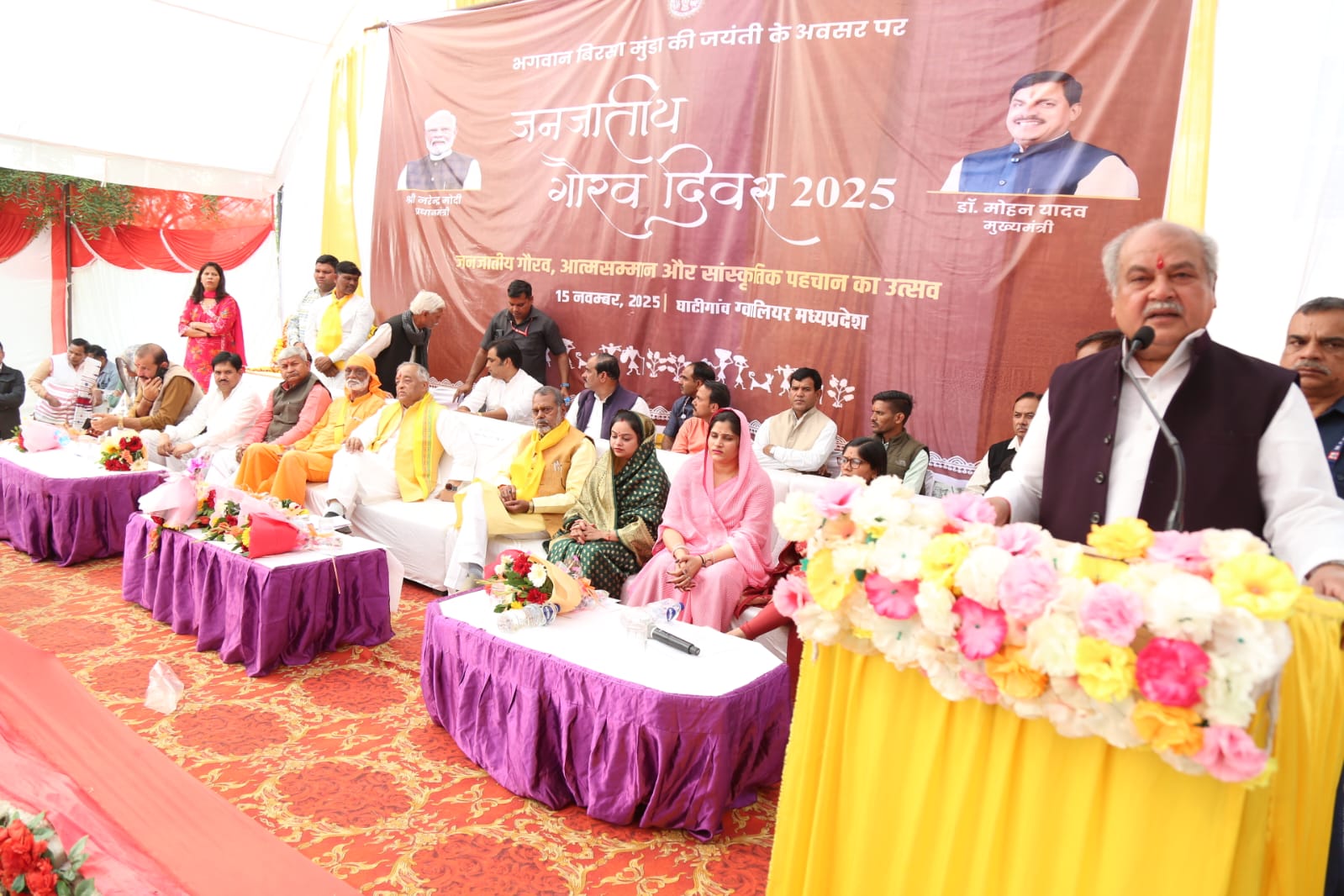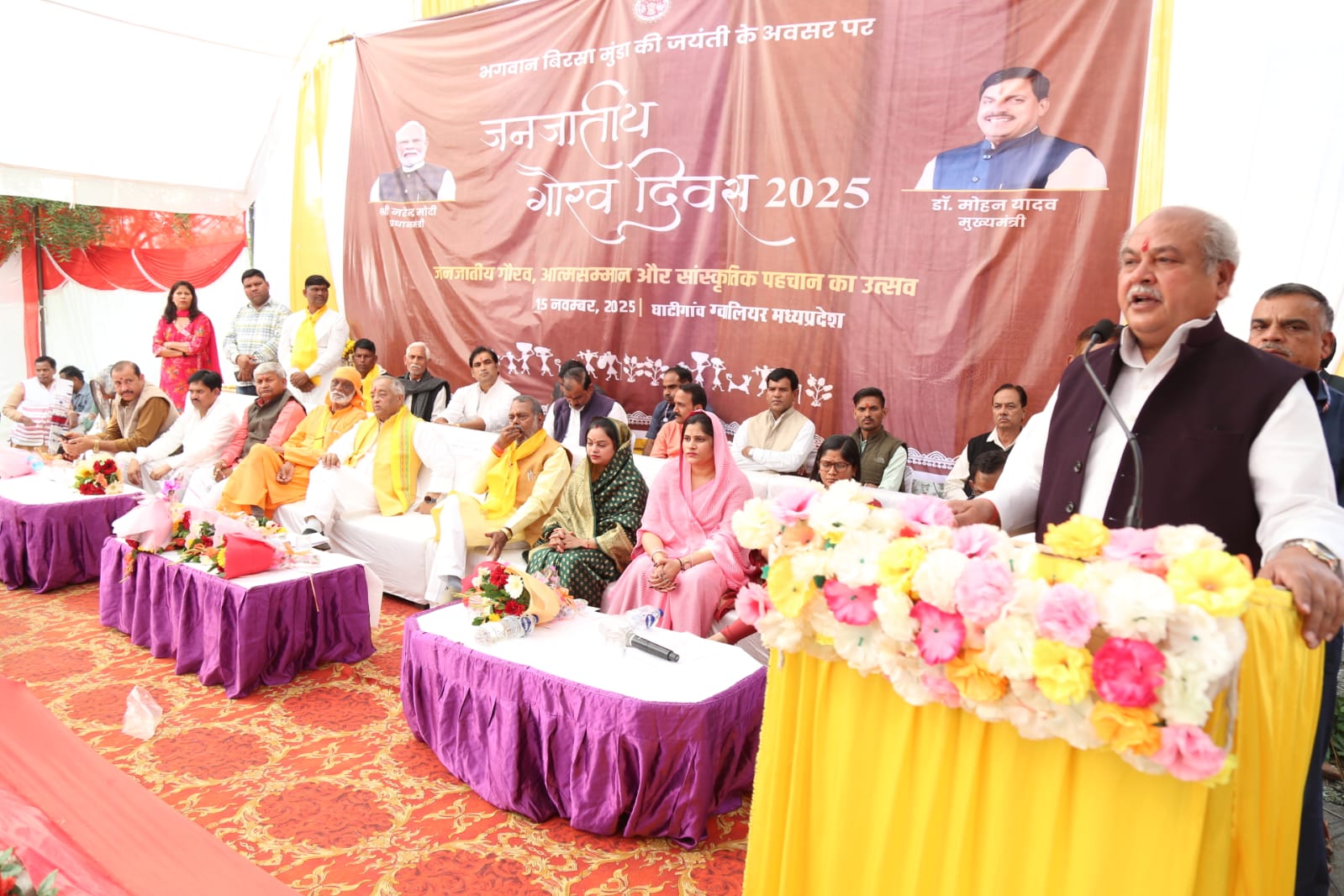 विधान सभा अध्यक्ष श्री नरेन्द्र सिंह तोमर ने कार्यक्रम को संबोधित करते हुए कहा कि जनजाति वर्ग के नायकों ने देश के लिये हुए हर संघर्ष में न केवल योगदान दिया बल्कि अपने प्राणों की आहुति भी दी है। जनजाति नायक बिरसा मुण्डा ऐसी ही महान विभूति थे। उन्होंने कहा भारत में सदैव से पूँजी के बजाय त्याग, तपस्या, बलिदान व व्यक्ति के गुणों की पूजा होती रही है। इसीलिये जनजाति नायक बिरसा मुण्डा को भगवान कहा जाता है और पूरा देश उनके चरणों में नमन करता है। श्री तोमर ने कहा खुशी की बात है कि प्रधानमंत्री श्री नरेन्द्र मोदी की पहल पर भगवान बिरसा मुण्डा के नाम से जनजातीय गौरव दिवस मनाया जा रहा है।