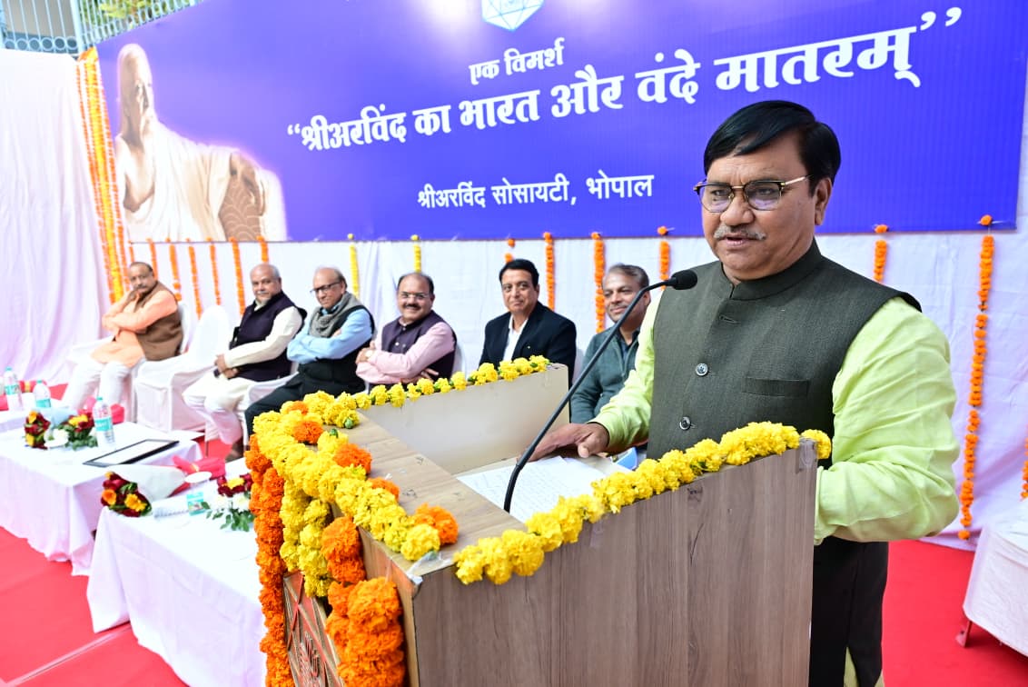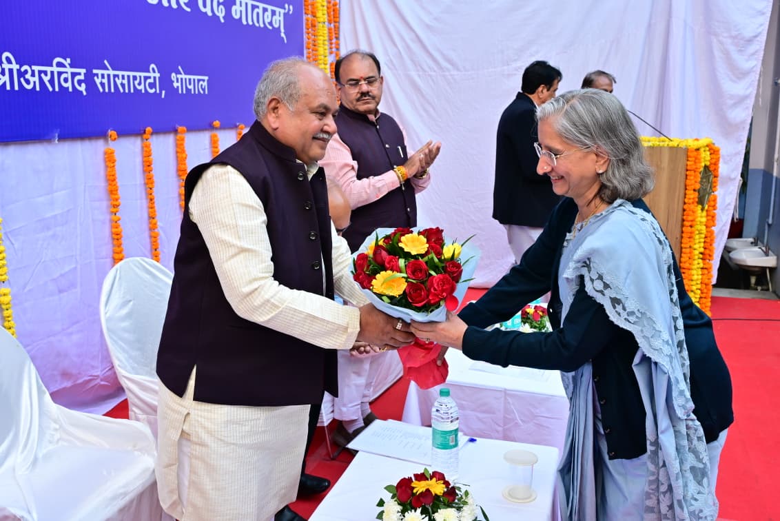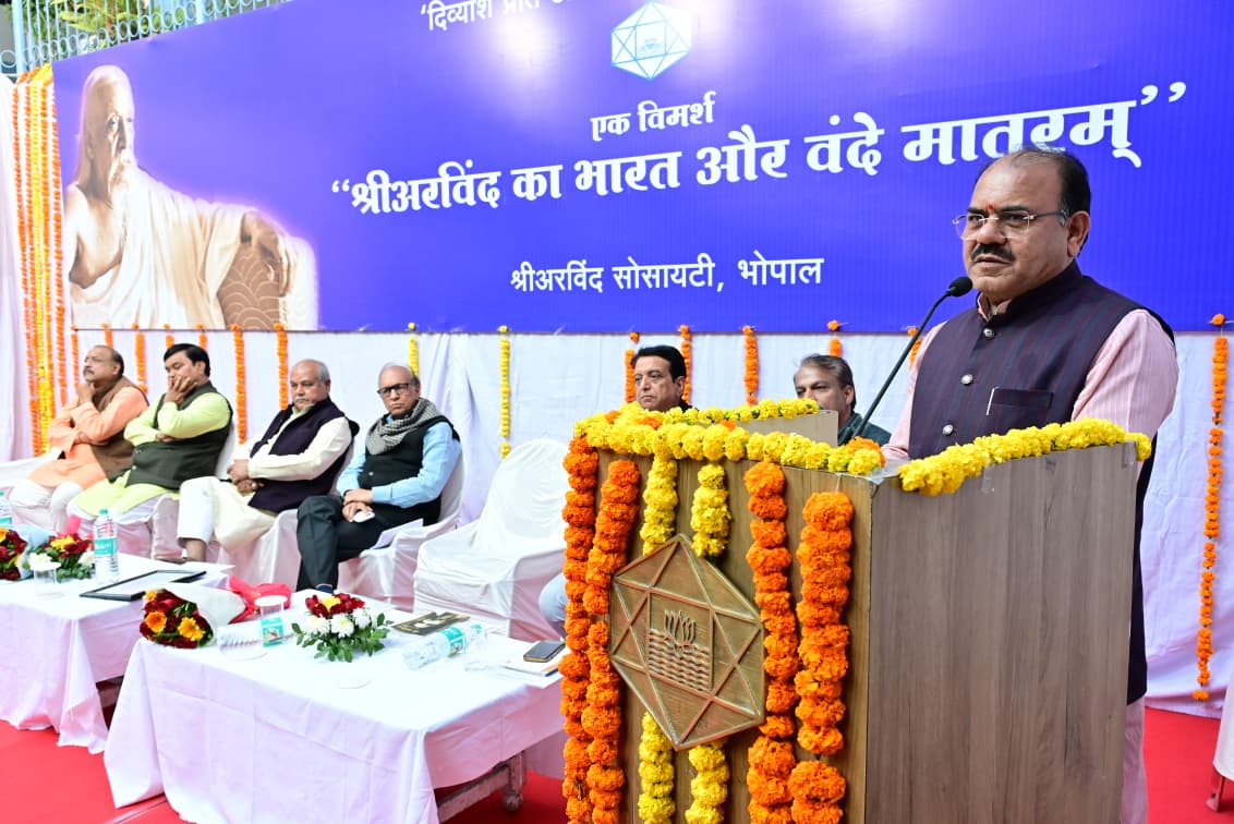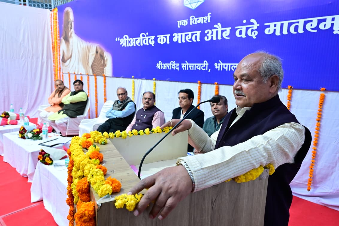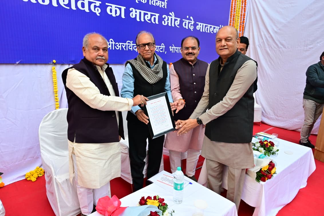 यह विचार मंगलवार को श्री अरविंद सोसायटी, शाखा भोपाल के दिव्यांश रजत जयंती समारोह में विधानसभा के अध्यक्ष नरेंद्र सिंह तोमर से व्यक्त किए। श्री तोमर ने कहा कि यह गीत आज भी प्रासंगिक है और हमें आगे बढ़ने और राष्ट्र हित में लगातार प्रयत्न करने की प्रेरणा देता है। रजत जयंती समारोह में " श्री अरविंद का भारत और वंदे मातरम " विषय पर आयोजित विमर्श के दौरान श्री अरविंद की व्याख्या करते हुए कहा वे आध्यात्मिक पुरूष ही नहीं, कर्मयोगी भी थे। उन्होंने कहा कि श्री अरविंद का विचार था कि सिर्फ स्वतंत्रता भारत के लिए पर्याप्त नहीं होगी, हमें तो पूर्ण स्वराज चाहिए। इसी अवधारणा को लेकर आज देश के प्रधानमंत्री नरेंद्र मोदी भी वंदे मातरम के माध्यम से देश में पूर्ण स्वराज की स्थापना का उद्घोष कर रहे हैं। इससे पहले श्री तोमर ने कहा कि भगवान ने बंकिम बाबू को वंदे मातरम लिखने की प्रेरणा दी और उसी अनुकंपा को आगे बढ़ाते हुए महर्षि अरविंद को भी अग्रसर किया।